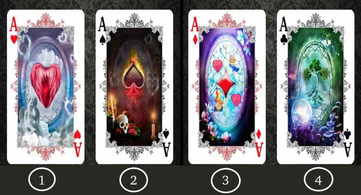 شما در شرف شرکت در تست شخصیت شناسی کارت هستید، ابزاری که اغلب در زمینه های معنویت، روانشناسی و رشد شخصی برای ارائه دانش یا وحی استفاده می شود. در این مورد، از شما خواسته می شود که از بین چهار کارت آس که در یک تصویر ارائه شده است، انتخاب کنید.
