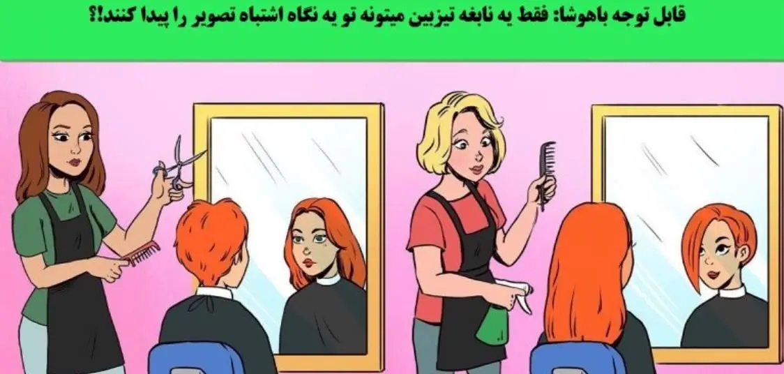 اگر می خواهید خود و یا اطرافیان خود را محک بزنید، توانایی ها و مهارت های شناختی آن ها را بسنجید در جای درستی قرار گرفته اید. ما اکنون تصویر آزمون شناسایی اشتباه آرایشگاه را برای شما به اشتراک می گذاریم. یادتان باشد برای رمزگشایی و حل آزمون شناسایی اشتباه آرایشگاه فقط 3 ثانیه فرصت دارید. زمان شما شروع شد.