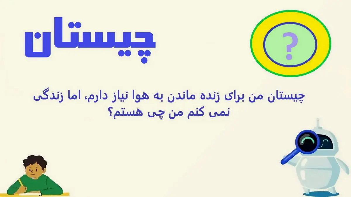 چیستان من برای زنده ماندن به هوا نیاز دارم، اما زندگی نمی کنم من چی هستم؟را اگر بتوانید در 8 ثانیه بگویید نشان می دهد دارای مغزی فعال و ذهنی تیزبین می باشید.