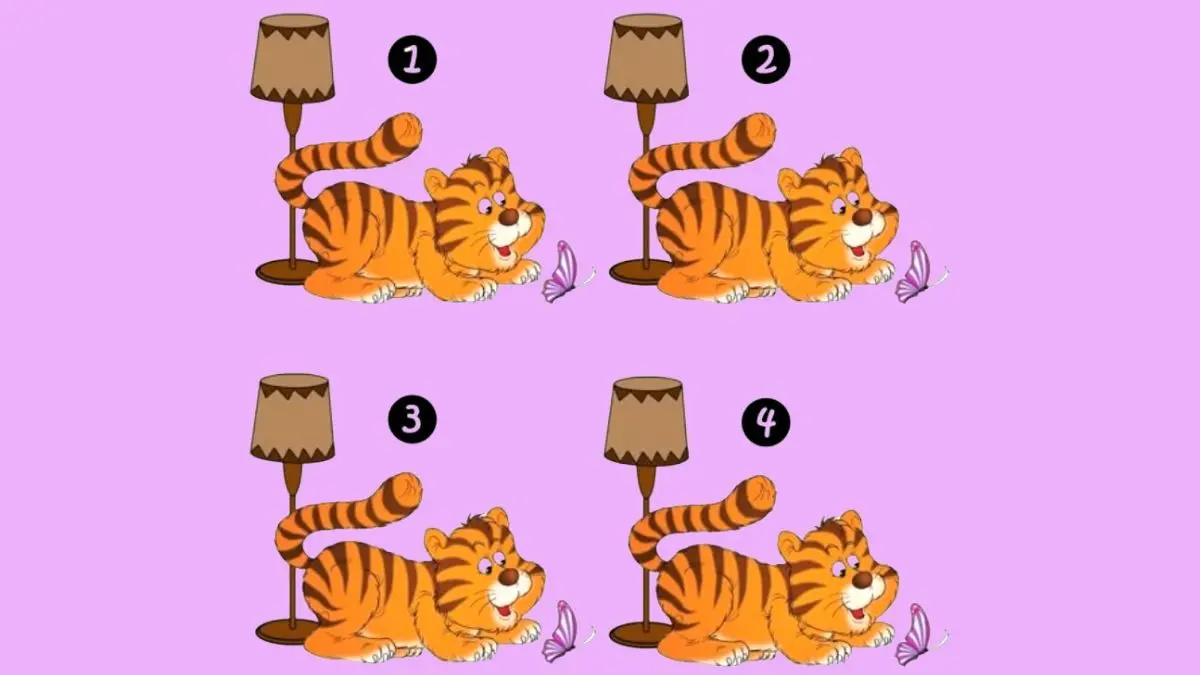 به نظر میرسد تصویر، چهار تصویر کارتونی از یک توله ببر نارنجی است که روی زمین کنار یک چراغ ایستاده دراز کشیده و به یک پروانه بنفش نگاه میکند. چالش این است که توله ببر عجیب و غریب را در میان چهار توله ببر پیدا کنید.